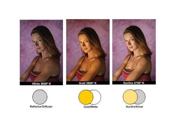 Gold (золотистый) - понижает цветовую температуру (3800ºK) отражаемого света, позволяет добиться «теплого» оттенка, что часто необходимо при съемке портрета. При использовании золотистой отражающей поверхности интенсивность отраженного света снижается незначительно.