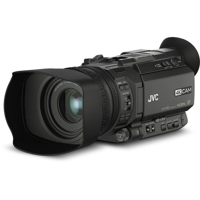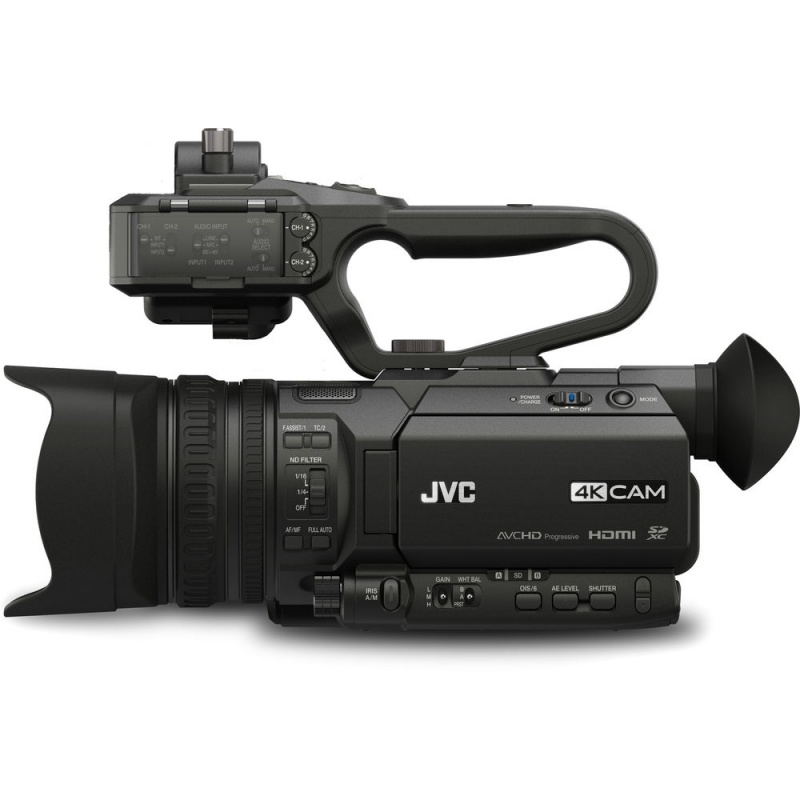 Компактная и легкая, а также экономически эффективная, GY-HM170E собрана в прочном корпусе, органы управления на котором расположены так, как это привычно для профессионалов видеосъемки. Она выполняет съемку в форматах 4K Ultra HD, 4:2:2 Full HD (50 Мбит/с) и SD. Встроенный объектив с 12-кратным оптическим зумом и 4K CMOS сенсор позволяют захватывать и записывать видео с разрешением 4K Ultra HD напрямую на карты памяти SDHC/SDXC. Камера оснащена двумя слотами для карт памяти SDHC/SDXC, что позволяет вести запись как в непрерывном последовательном режиме, так и в параллельном, сохраняя две копии материала. Вывод видео 4K UHD в реальном масштабе времени осуществляется через HDMI.