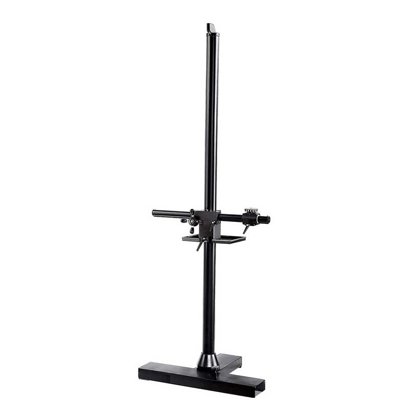 Это самый массивный стенд серии. Он оборудован массивной центральной колонной из анодированного алюминия высотой 230 и 100 см струбциной. Струбцина стенда оснащена поворачиваемой на 360° платформой для камеры, противовесом, подставкой для аксессуаров, а также механизмом реечной передачи, благодаря которому она перемещается плавно и с высокой точностью. Литая основа стенда оборудована колёсами, управлять которыми можно педалью.