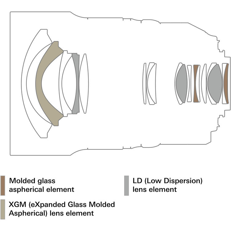 1. Улучшенный оптический элемент с использованием инновационной технологии XGM. Оптическая конструкция, состоящая из 18 элементов в 13 группах, XGM элементы, помещенные в передней группе, и несколько прессованных асферических элементов, а также LD элементы (Low Dispersion), используемые по всей оптической системе эффективно устраняют геометрические искажения, такие как хроматические аберрации и боковые дисторсии, что позволяет объективу обеспечивать превосходное качество изображения на всем диапазоне зумирования, как в центре кадра, так и по углам.