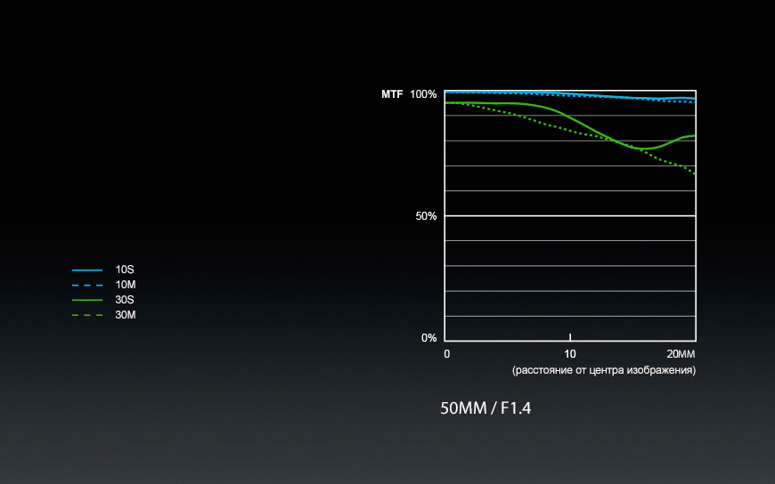 Для объективов с функцией компенсации дисторсии горизонтальная ось диаграммы MTF показывает расстояние от середины исправленного изображения.