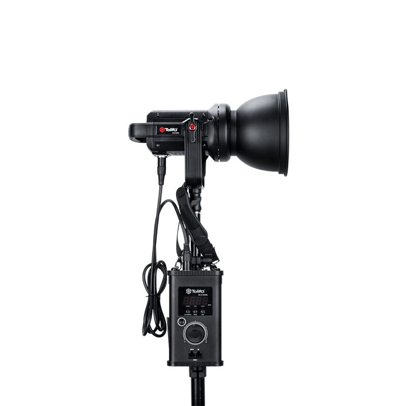 Для большего удобства и облегчения конструкции самого моноблока управление и адаптер питания вынесен в отдельный блок управления. При помощи кнопок и колесика вы можете настраивать работу прибора, а дисплей проинформирует вас о рабочих параметрах и уровне заряда. На обратной стороне находится адаптер для батарей типа V-mount, благодаря которому вы можете использовать SK-D120BL без подключения к сети.