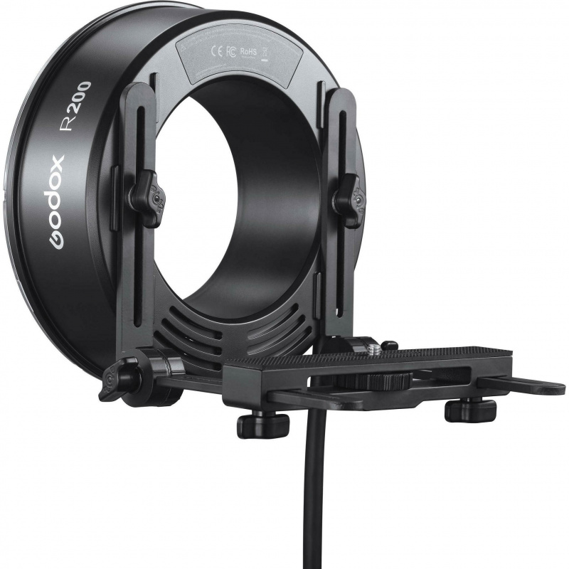 Кронштейн для зонта может использоваться для присоединения к R200 дополнительно приобретаемого параболического зонта Godox. Совместное использование кольцевой вспышки и параболического зонта помогает создать яркое равномерное освещение, которое легко контролировать. Форма кронштейна позволяет регулировать положение зонта относительно источника света для смягчения или затемнения контуров теней.