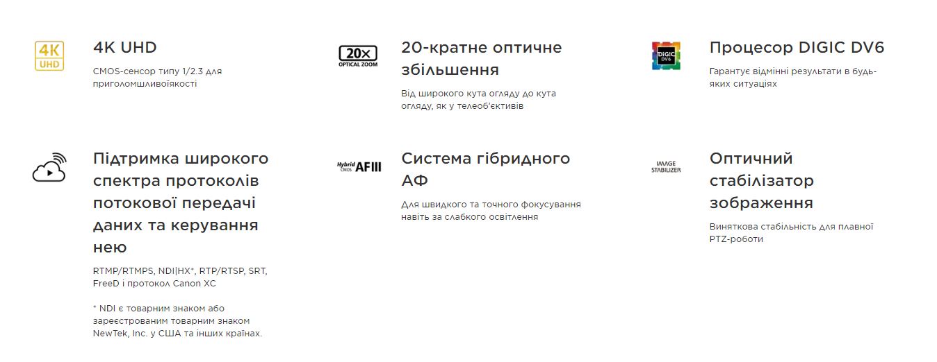 Фиксируйте все важные детали благодаря усовершенствованной 4K-оптике Canon с гибким 20-кратным оптическим увеличением, который охватывает широкий диапазон фокусных расстояний 29,3-601-мм (эквивалент 35-мм) и обеспечивает большую гибкость рабочей работы. Камера оснащена системой стабилизации изображения для минимального искажения изображения во время движения.