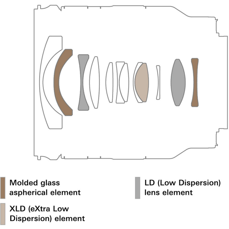 оптическая схема — 12 элементов в 10 группах, включая 2 литых стеклянных асферических элемента (GM), один элемент со сверхнизкой дисперсией (XLD) и два элемента с низкой дисперсией (LD).