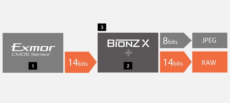 Во время съемки в формате RAW 14-разрядные цифровые сигналы, получаемые из аналоговых путем преобразования в матрице, передаются на препроцессор LSI и процессор BIONZ X, где выполняется их обработка в формате 16 бит перед обратным преобразованием в конечное 14-разрядное RAW-изображение. Это позволяет достичь более мягкой и естественной тональной градации. 1. Матрица. 2. Новейший высокоскоростной препроцессор LSI. 3. 16-разрядная обработка изображения.