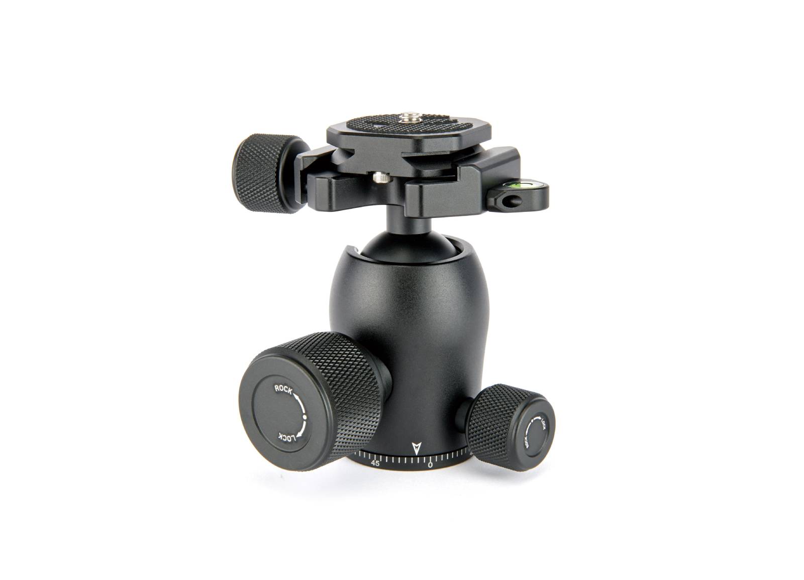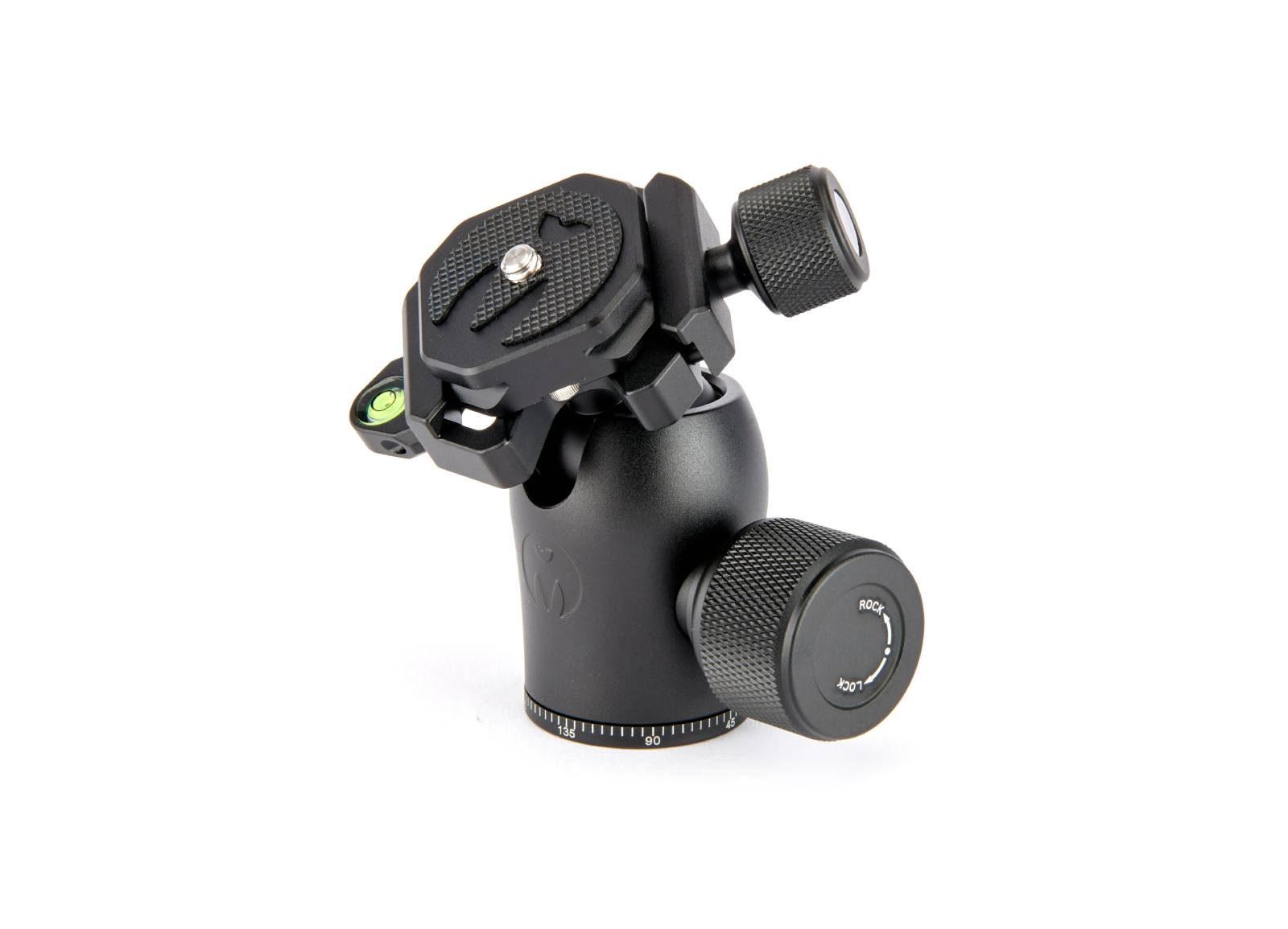AirHed Pro имеет ручку с накаткой, которая используется для управления шаровой головкой. Шар можно затягивать в различных положениях, а всю головку можно поворачивать на 360 ̊. Медная ручка управления затягивает зажим, поэтому можно надежно удерживать камеру на месте. Голова оснащена пузырьковым уровнем, что обеспечивает идеальное выравнивание изображений.