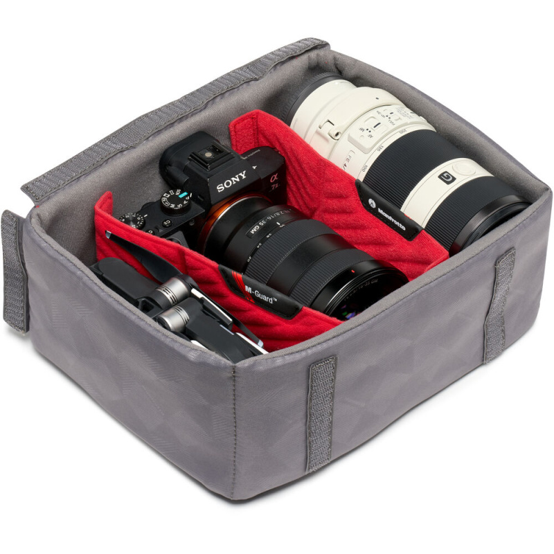 Мягкий куб камеры имеет размеры 4,1 x 9,8 x 7,7 дюйма, имеет объем 3 л и вмещает камеру CSC с датчиком кадрирования с прикрепленным объективом, дополнительным зум-объективом и аксессуарами.
