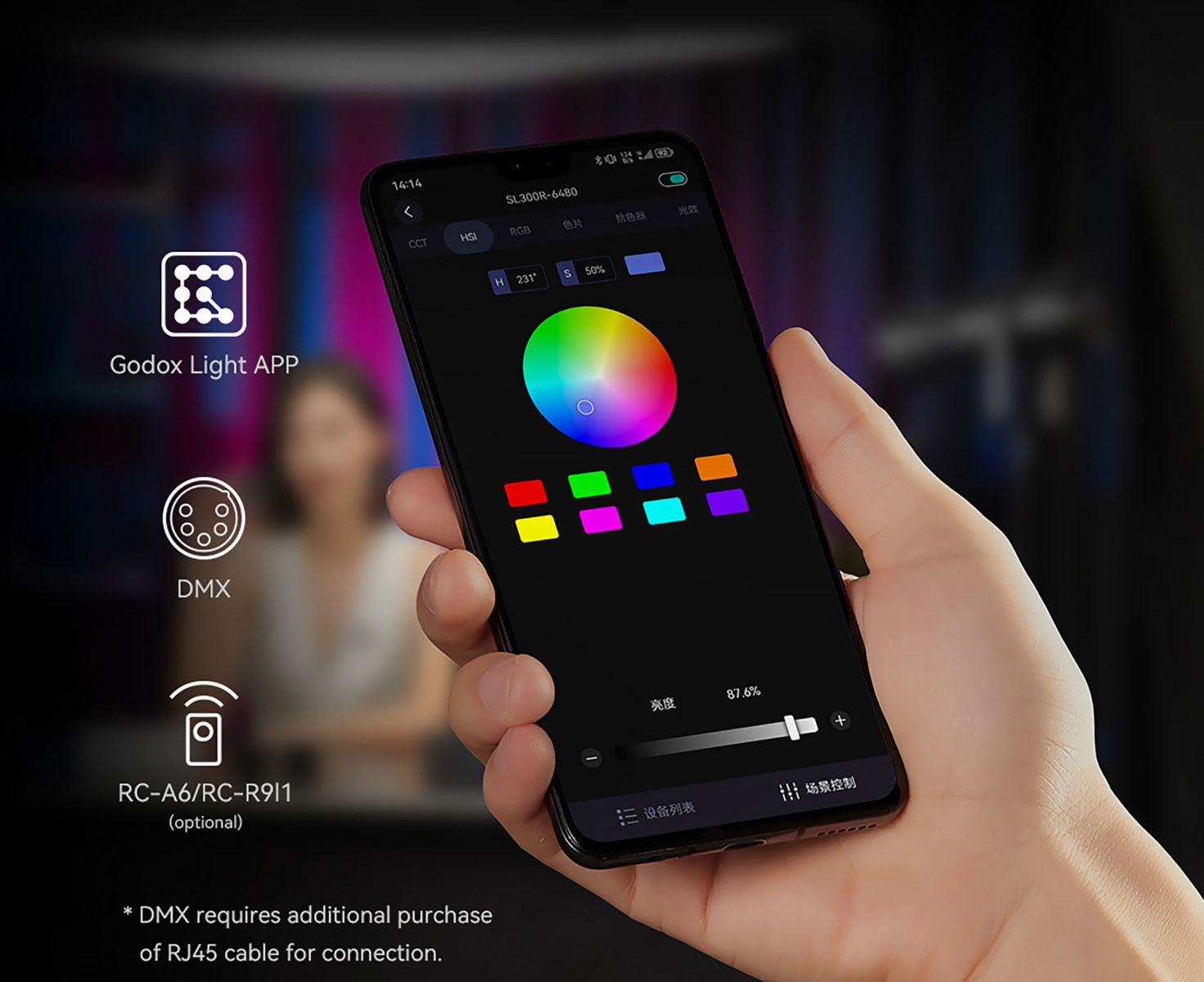 Видеомир Godox SL150R предназначен для разных сценариев применения, поэтому он поддерживает множество способов управления, включая совместимость с мобильным приложением GodoxLight, пультом радиоуправления, консолями DMX512 и имеет удобную встроенную панель управления, позволяющую оптимизировать эффективность работы.