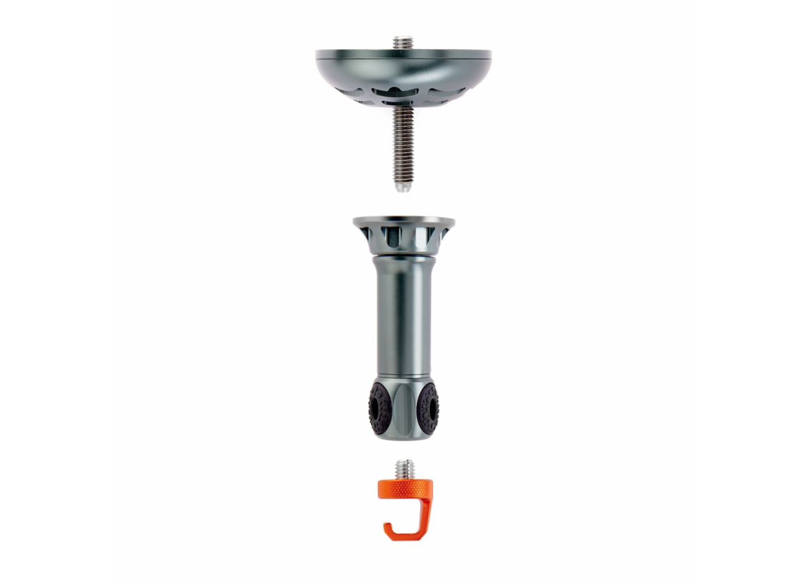 Сферическая выравнивающая голова 3 Legged Thing Half Bowl имеет резьбу 3/8"-16, позволяющую закрепить сверху штативную головку, а также защитные винты, которые можно затянуть, чтобы создать еще более надежное соединение с головкой. Основание ручки имеет рифленый крючок, который можно снять, чтобы получить дополнительную точку крепления с внутренней резьбой 3/8"-16 для дополнительных аксессуаров.