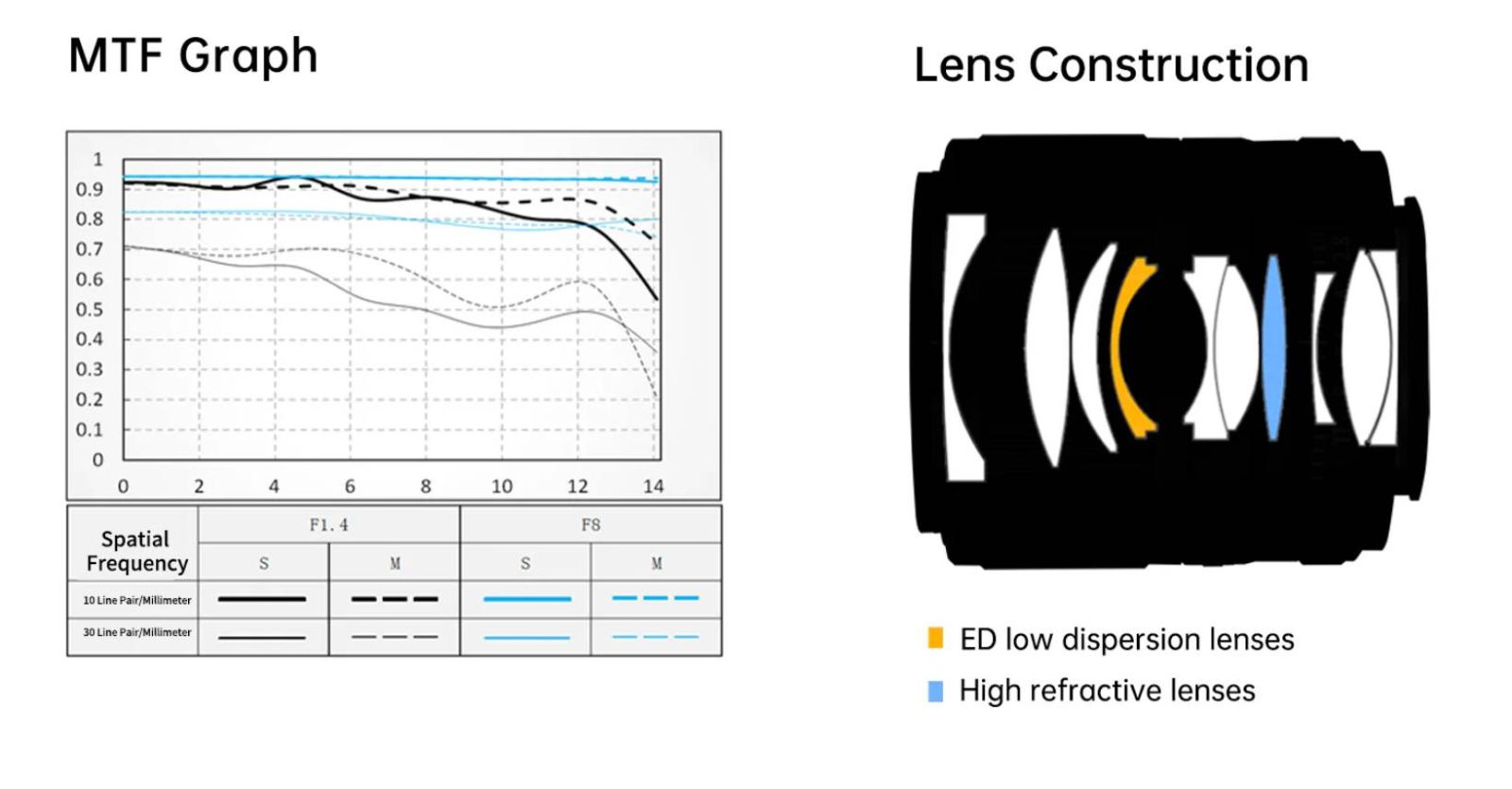 Оптическая схема объектива включает 1 элемент из стекла с низкой дисперсией (ED) и 1 элемент с высоким коэффициентом преломления для минимизации искажений. При диафрагме F1.4 глубина резкости очень мала, из-за чего области вокруг точки фокусировки становятся размытыми.