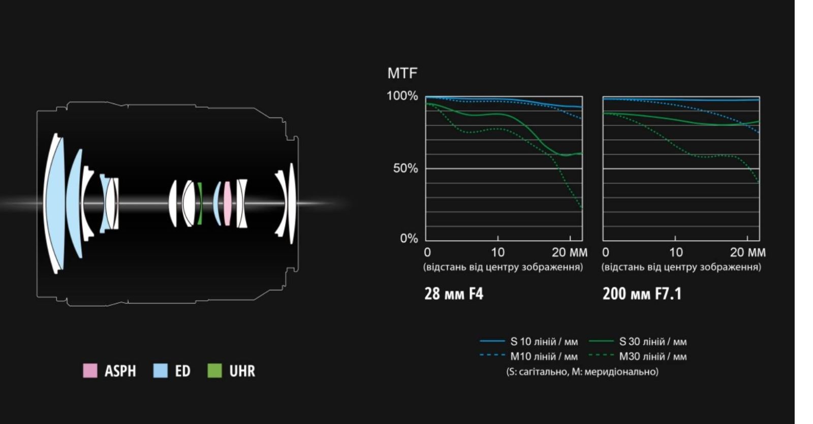 Оптимизированная конфигурация предусматривает 17 элементов в 13 группах, включая 1 асферическую линзу, 4 линзы из стекла ED и 1 линзу UHR для минимизации аберраций и обеспечения отличного разрешения.