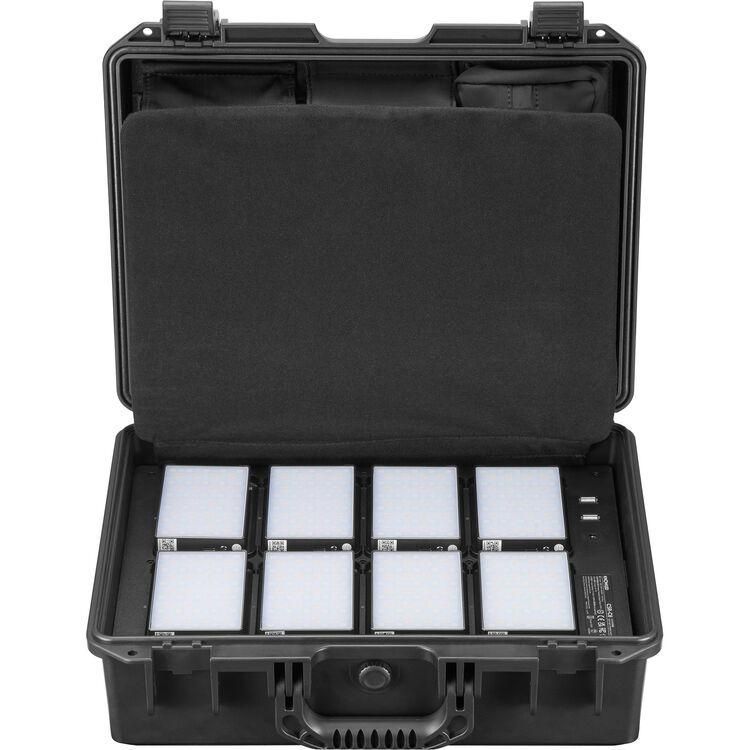 Кейс. В комплекте с фонарями присутствует кейс для зарядки, транспортировки и хранения. Он поддерживает одновременную зарядку всех 8 светильников в беспроводном режиме. Сам кейс заряжается от переменного тока 100–240 В или от аккумулятора V-Mount. Дополнительно в кейсе есть 2 порта USB для зарядки ваших гаджетов.