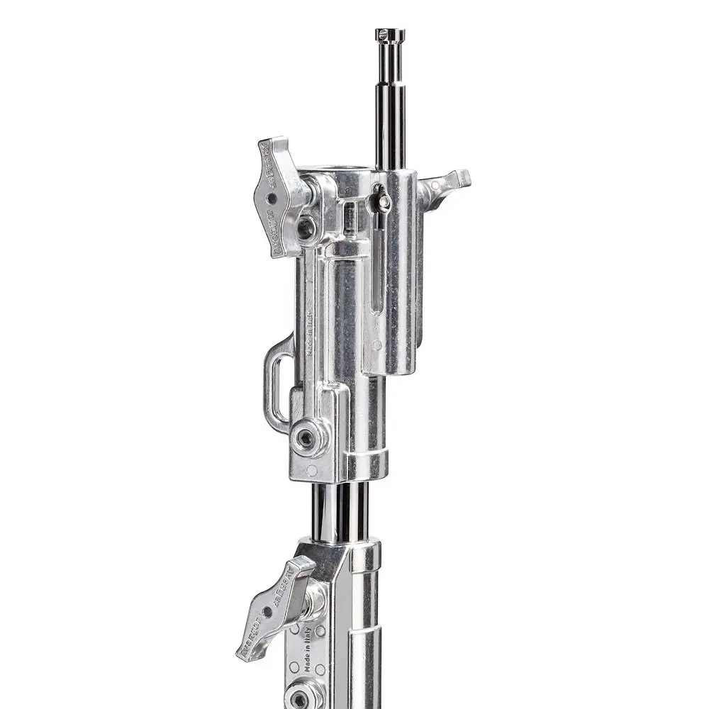 Основу составляет стальная секционная стойка с надёжными замками и журавлевая стрела с поворотным узлом. Такая конструкция уменьшает вибрации, повышает устойчивость и позволяет работать с крупными модификаторами без «провисания». Комбо-голова (Junior 28 мм + Baby 16 мм) обеспечивает широкую совместимость: вы легко подключите кино-свет с Junior-шпинделем или стандартные студийные приборы через Baby-штифт. Выравнивающая нога регулируется по высоте, чтобы база не «гуляла» на неровностях.