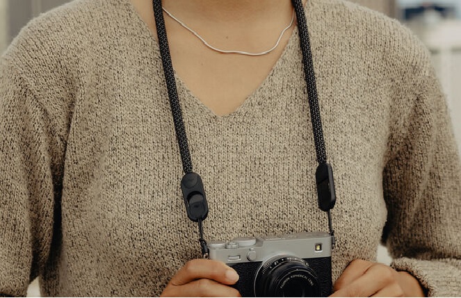 Мягкая, плетеная из нейлона и полиэстера веревка обеспечивает оптимальный баланс прочности и эластичности для комфортной переноски камеры.