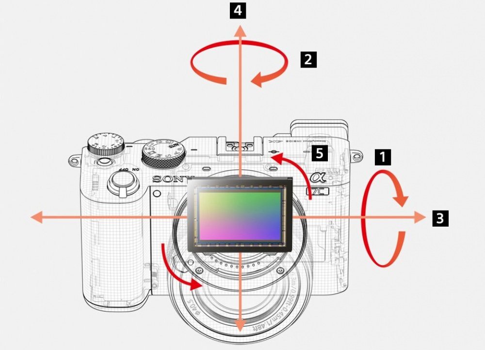 Механізм 5-осьовий стабілізації зображення камери Sony α7C компенсує п'ять типів тремтіння камери. Якість зображень залишається чудовим навіть при зйомці без гіростабілізатора або вночі. Серед цих типів [1, 2] кутові тремтіння (поперечної і вертикальної осей), часто з'являються в телеоб'єктивах, [3, 4] зрушення по осях X і Y при збільшенні зображення, а також [5] поворотні тремтіння (по осі Z), небажані під час нічної зйомки.