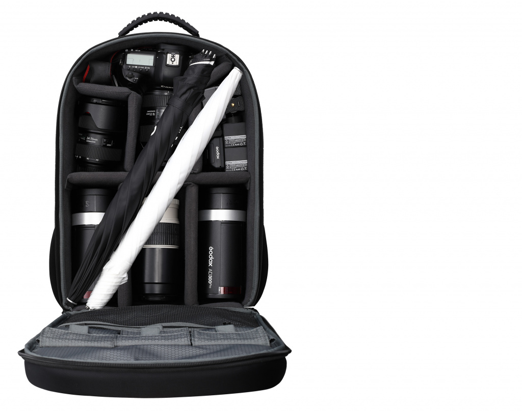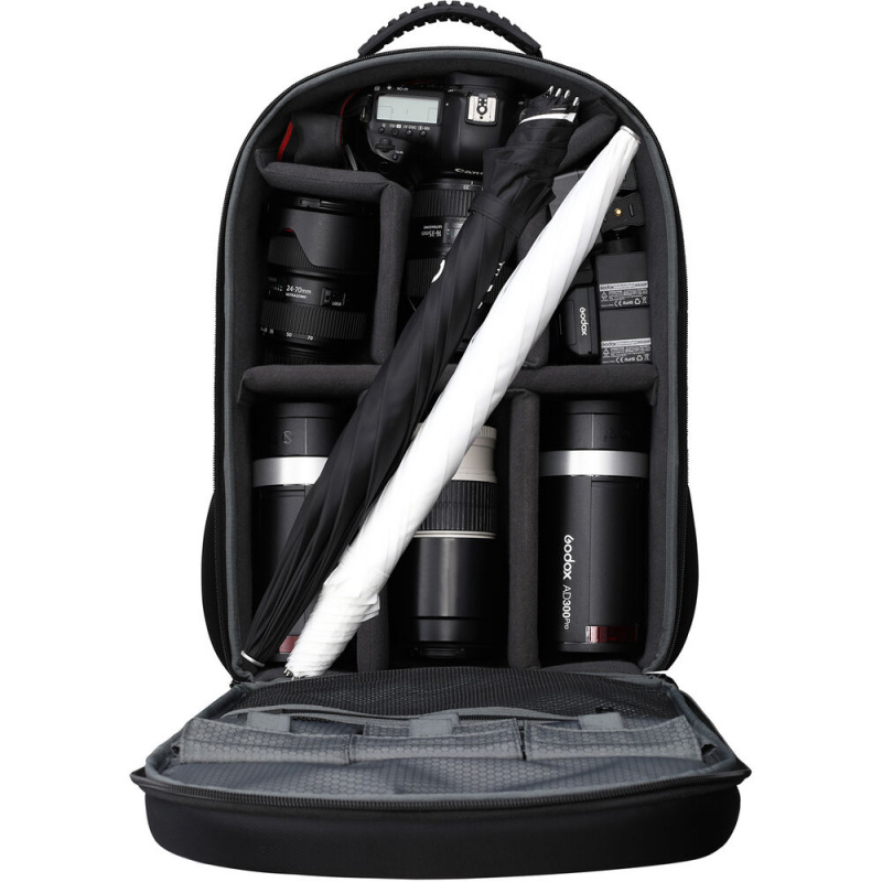 В комплект также входят два универсальных зонта диаметром 85 сантиметров, с серебристой внутренней поверхностью (UBL-085S) и просветной (UBL-085T), которые также помещаются в рюкзаке Godox CB20. Полупрозрачный зонт изготовлен из белой ткани, равномерно рассеивающей свет, что обеспечивает приятный мягкий светотеневой рисунок. Серебристый зонт поможет получить мягкое, широкое и высококонтрастное световое пятно. Оба зонта поставляются с соответствующими крышками-рассеивателями.