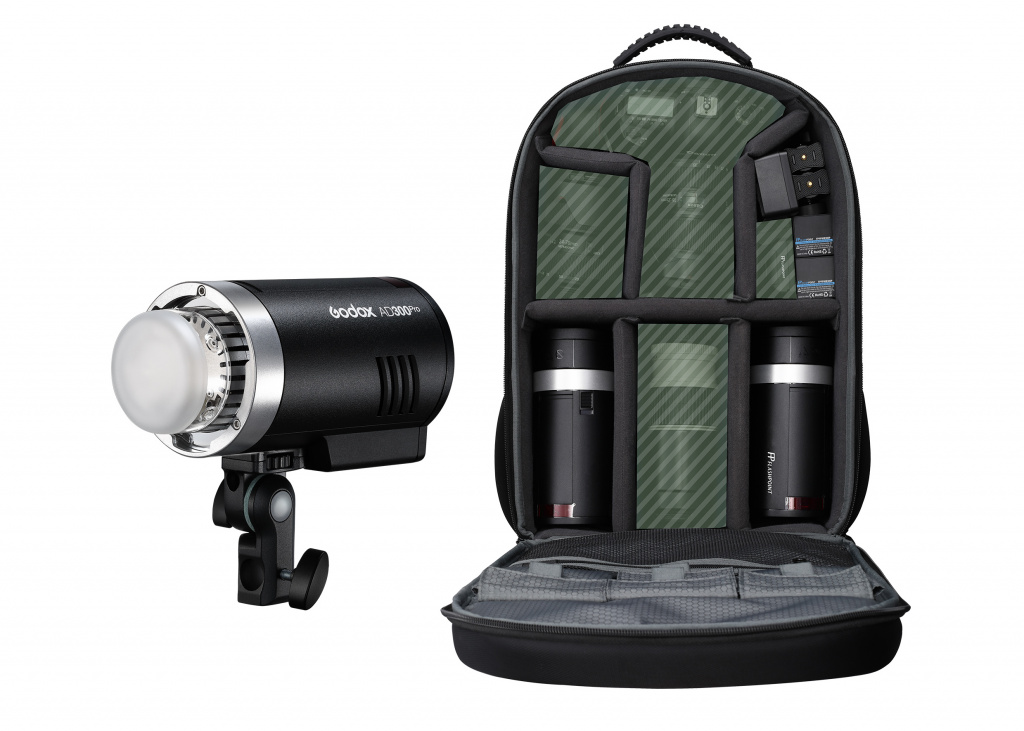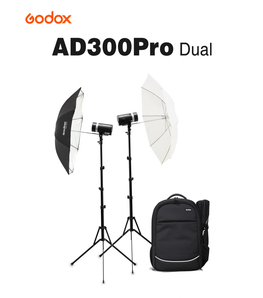 У комплект входять два акумуляторні спалахи Godox AD300Pro, які представляють собою невеликі і легкі моноблоки з максимальною потужністю імпульсу 300 Дж, точним регулюванням потужності з кроком 1/10 ступені і вбудованим пілотним світлом з регульованою колірною температурою для полегшення попередньої візуалізації. Godox AD300Pro повністю підтримує TTL і HSS, відрізняється коротким часом перезарядки і стабільної колірною температурою.