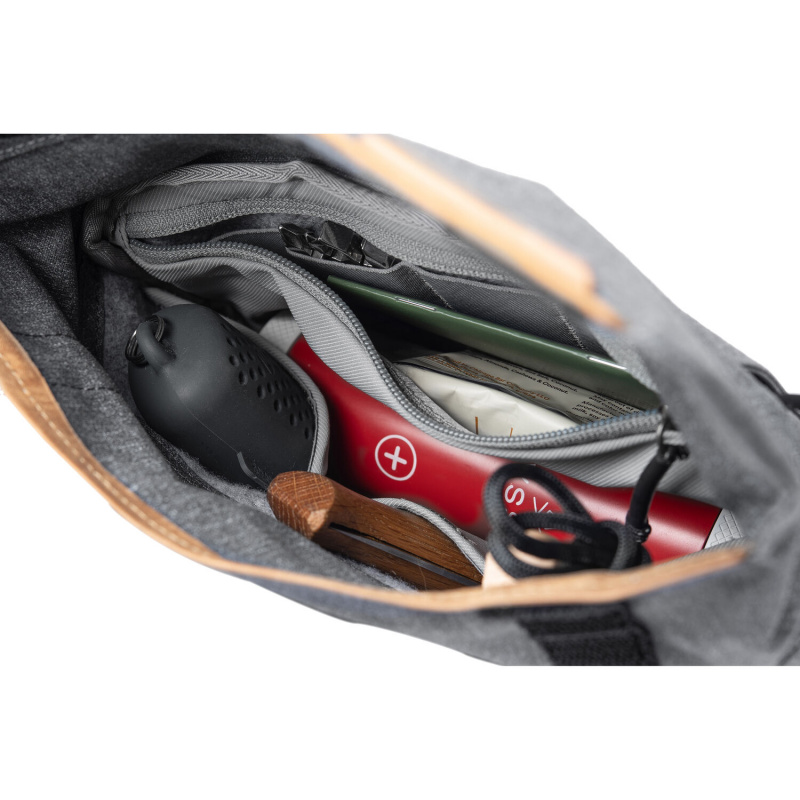 Кришка-клапан, що легко відкривається, забезпечує швидкий доступ до вмісту сумки, а також дозволяє вдвічі розширити або зменшити об'єм сумки в разі потреби. Еластичні кишені та кишені на блискавці добре продумані для безпечного розміщення кабелів, батарей, ключів, навіть невеликих камер або об'єктивів. Легкий регульований ремінь входить до комплекту та дозволяє носити сумку через плече, на задній кришці сумки є вбудовані петлі для ременя та розміщення сумки на поясі. За допомогою кліпси Capture Clip (продається окремо) можна тримати камеру поза сумкою, звільнивши додаткове місце для аксесуарів. Матеріал, з якого виготовлена сумка, є продуктом переробки та схвалений Bluesign, включаючи внутрішню м'яку підкладку та зовнішню тканину з 400D-нейлону з подвійним полі-покриттям.