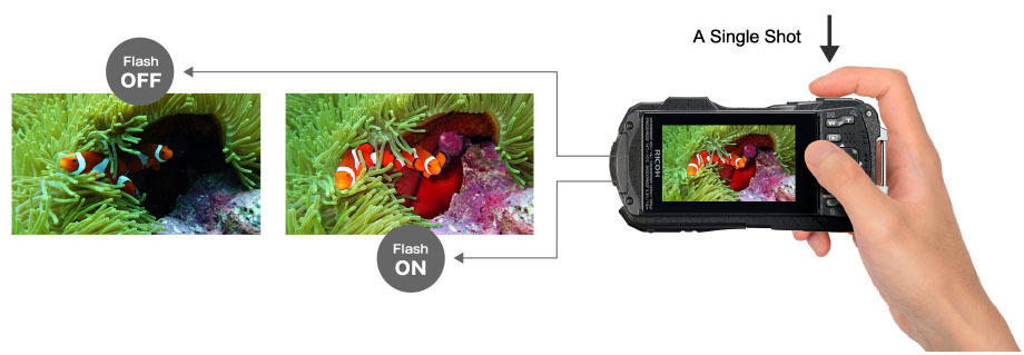 Крім того, оригінальний режим для зйомки зі спалахом дозволяє об'єднати в один знімок 2 послідовні кадри (зроблені з використанням спалаху і без спалаху), таким чином мінімізуючи негативний ефект від розсіювання світла на бульбашках і суспензії у воді.