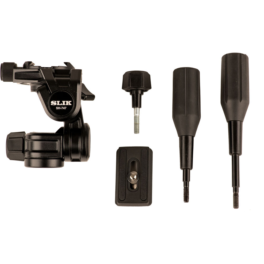 Головка SH-747 із 3-стороннім поворотом і нахилом, що входить у комплект, сумісна з Arca-типом і містить пластину для швидкого зняття. Це дозволяє точне переміщення по кожній осі окремо, без зміни налаштувань інших осей. Це точне керування підходить для точного позиціонування камер, підзорних труб і біноклів.
