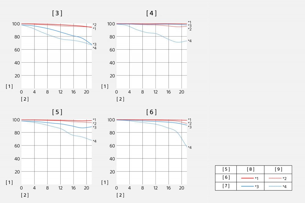 [1] Контрастність (%) [2] Відстань від оптичного центру об’єктива (мм) [3] Максимальна діафрагма [4] Діафрагма F/8 [5] Просторова частота [6] 10 пар ліній/мм [7] 30 пар ліній/мм [8] Радіальні значення [9] Тангенціальні значення