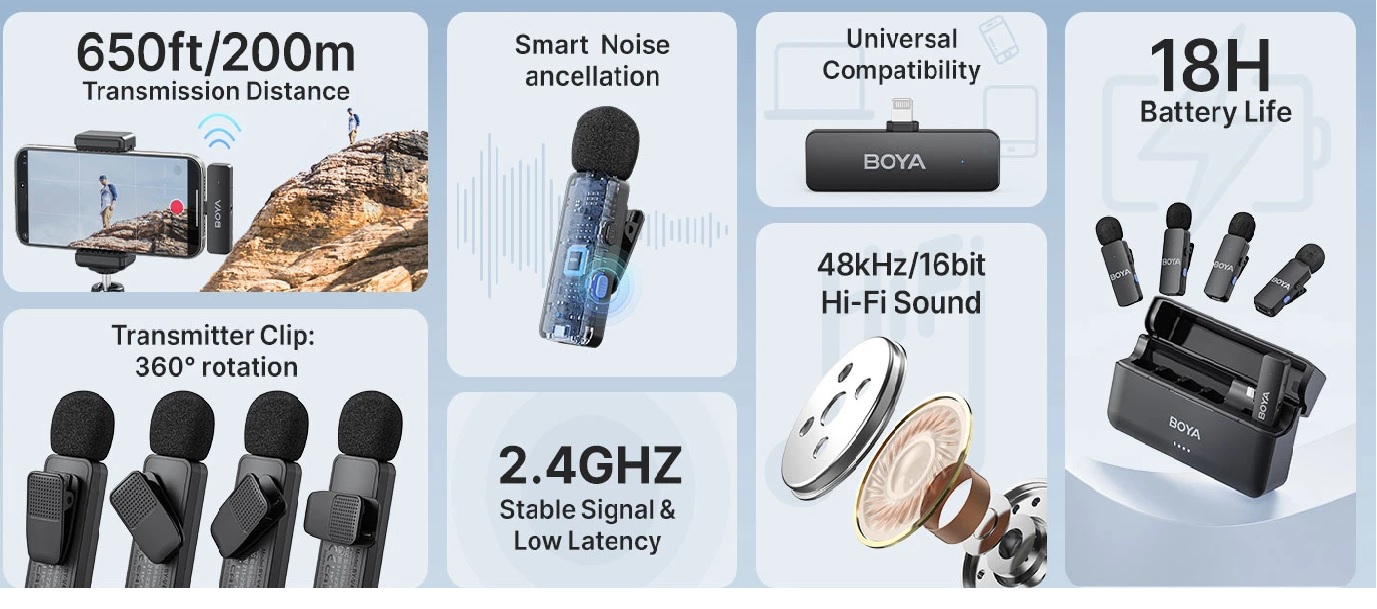 Вбудований всеспрямований мікрофон передавача забезпечує захоплення звуку на 360 градусів. Він також може похвалитися високоефективним шумозаглушенням, що дозволяє покращити ефект запису в шумній обстановці. Комплект BY-V4U оснащений цифровим аудіовиходом USB-C для смартфонів, планшетів, комп'ютерів та інших мобільних пристроїв. Крім того, приймачі мають USB-C порти, які підтримують заряджання та живлення пристроїв під час використання.